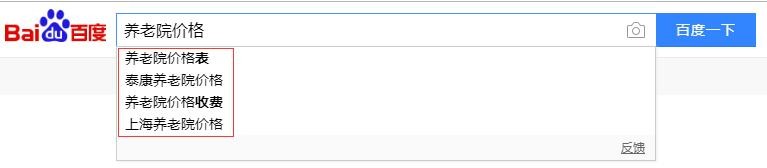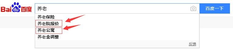 如下圖:百度搜索框輸入“養老” 只有“養老院報價”和“養老公寓”更有價值,轉化更高。